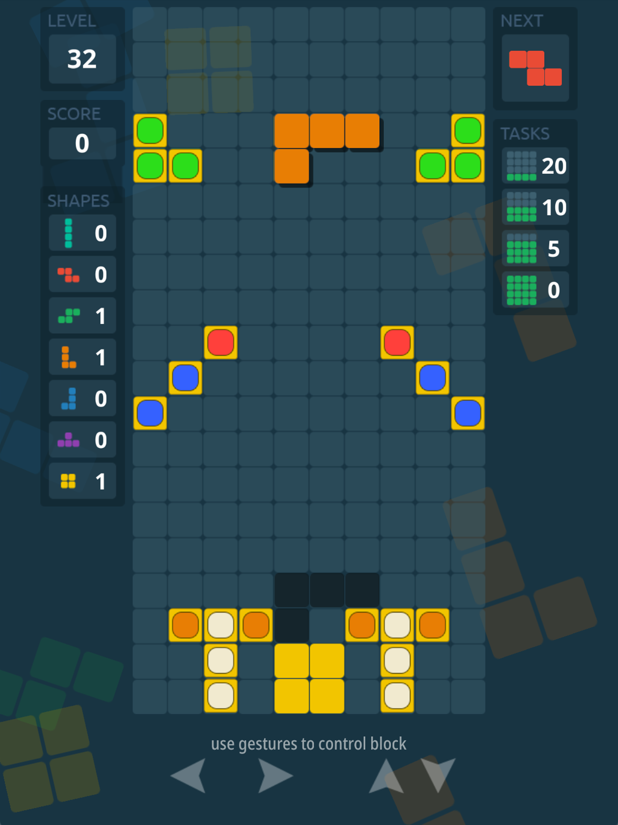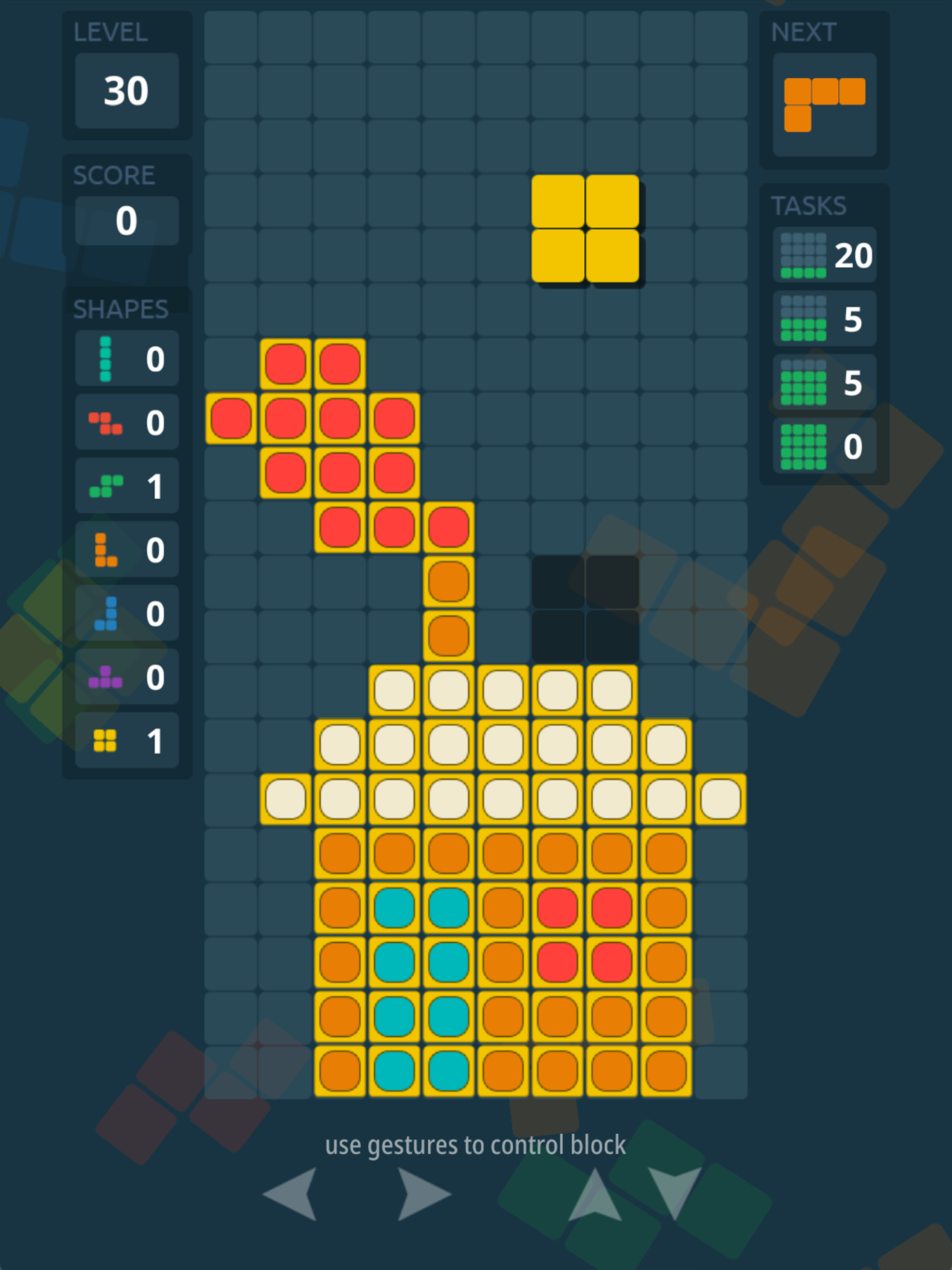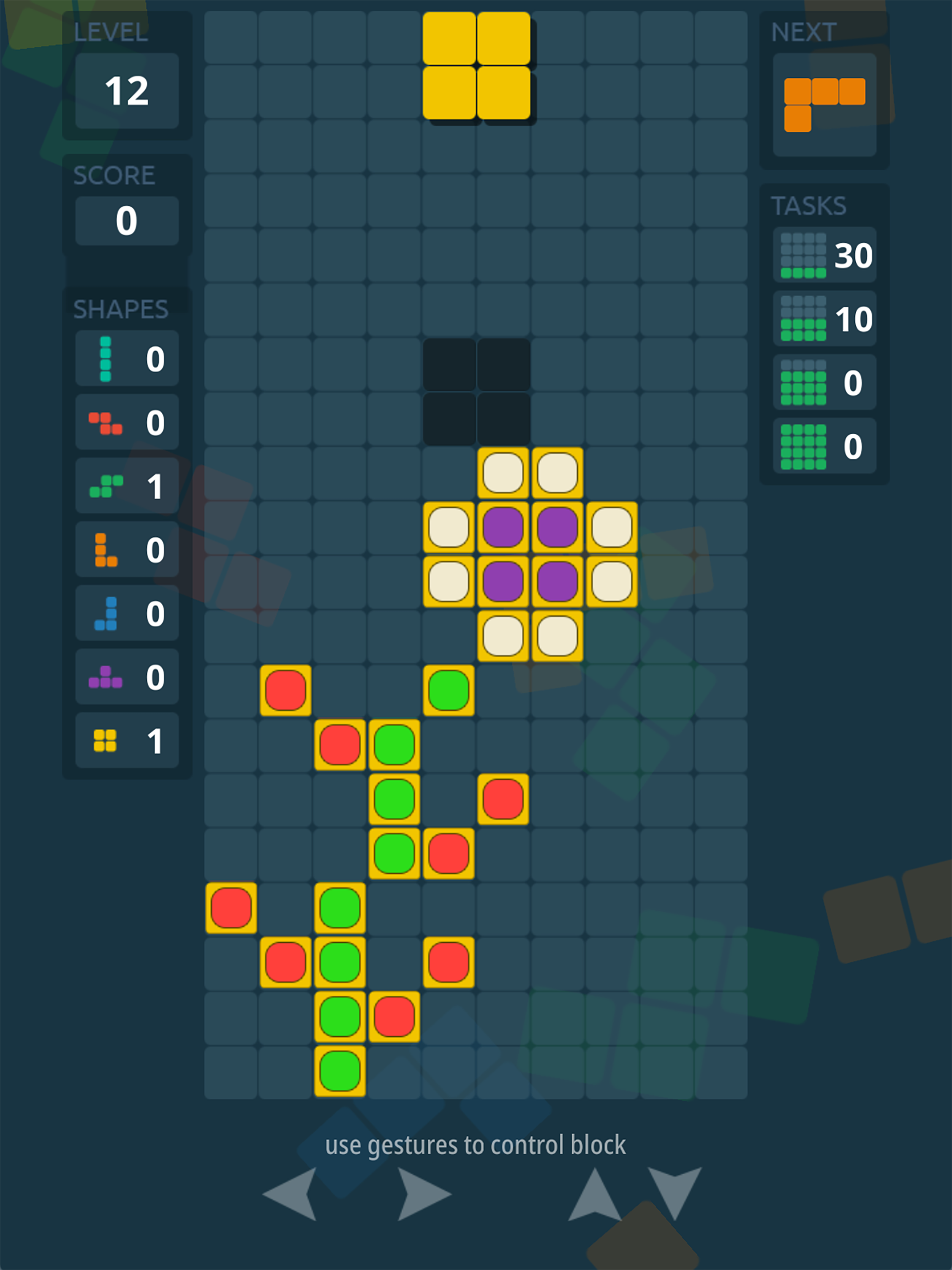 One unique feature of Tricky Blocks is that shapes move smoothly across the grid, rather than snapping abruptly from cell to cell, as in most Tetris games.